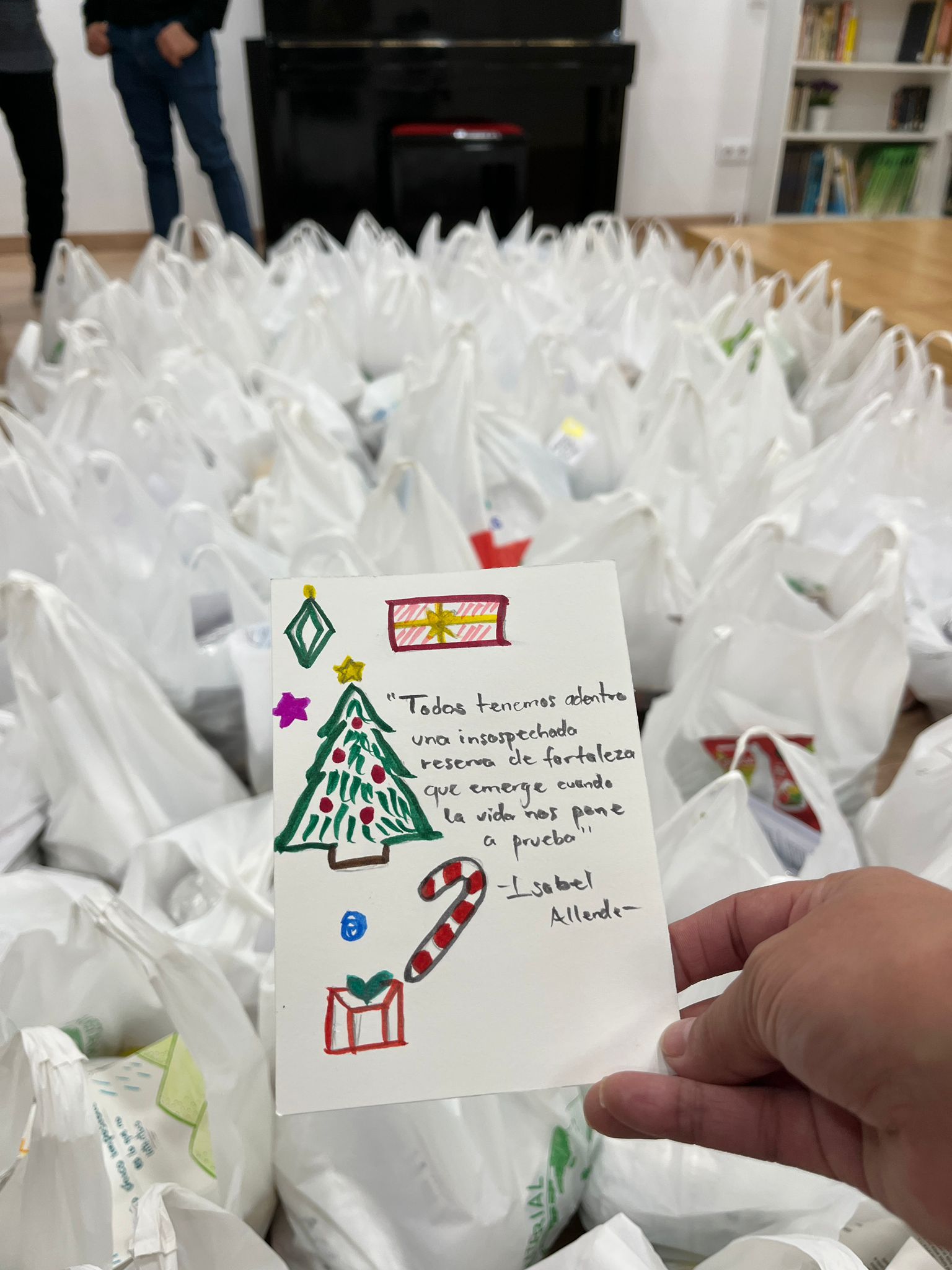 Con un esfuerzo coordinado, preparamos 108 bolsas de comida en las que había dos bocadillos, productos enlatados, un zumo, un batido, fruta, un yogur y algunos dulces. Junto a las bolsas de comida, también repartimos una postal artesanal con mensajes de esperanza y una hoja informativa sobre los diferentes recursos sociales de la ciudad de Barcelona.